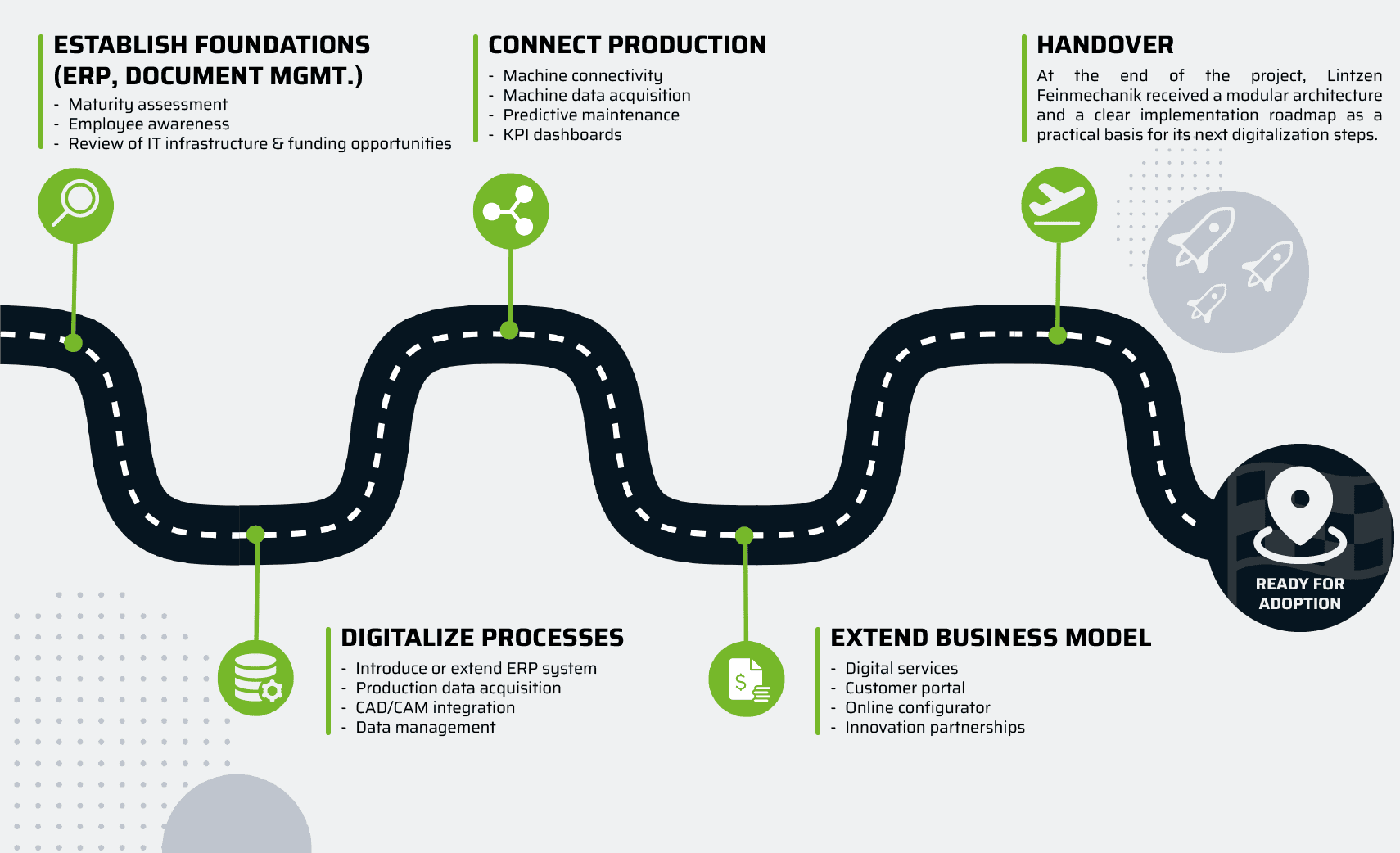 The project delivered a concrete digitalization concept tailored to Lintzen Feinmechanik’s current maturity level. A modular system architecture was defined that covers ERP and MES integration, machine connectivity, data management, cyber security and future AI use. On this basis, a structured implementation roadmap was created that puts these modules into a clear sequence and shows how media breaks can be reduced, systems can be linked and data can be made usable across operational and strategic levels. Together, these results provide a practical and ready-to-use foundation for starting the company’s digital transformation.
